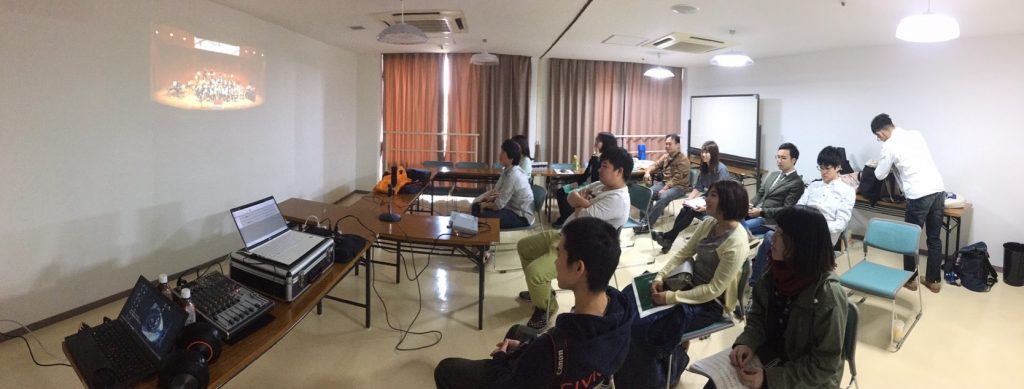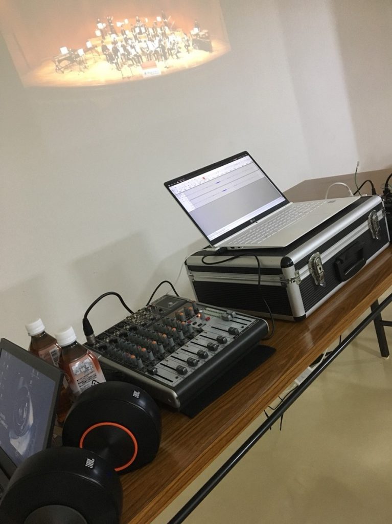 波「皆さん真剣な眼差しで見ておりますね。そして相も変わらず機材の凄さ! 第9回の練習では練習の最後に、その日に合奏した曲を録音する時に活躍しました。フィードバックにとても役立った!」